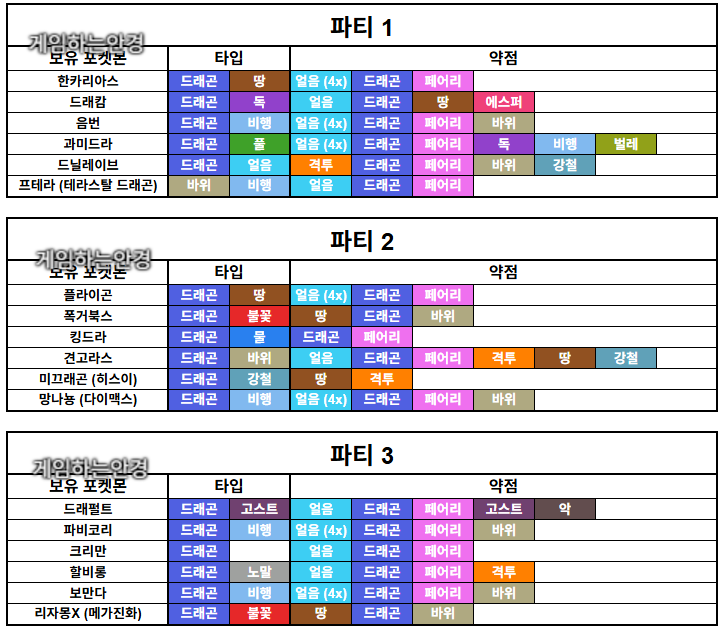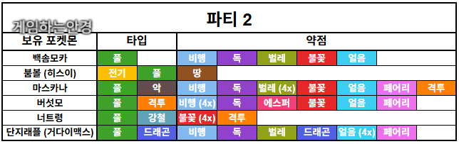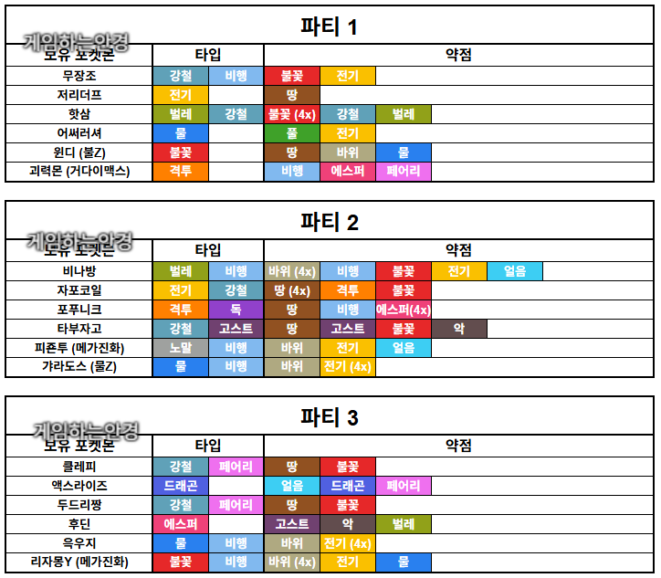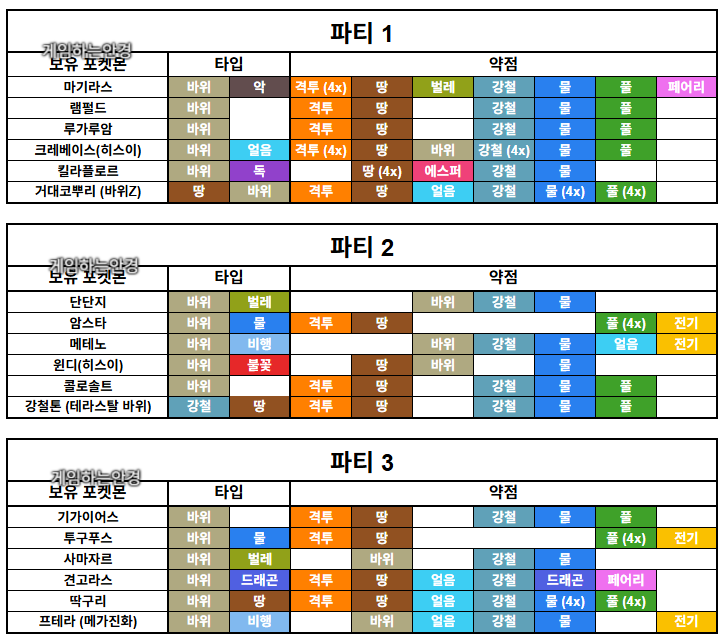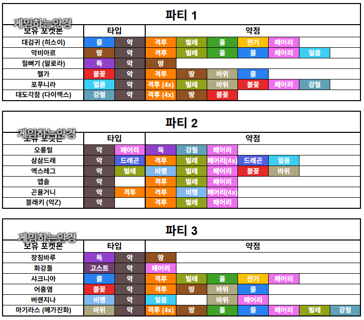 4배 약점은 4x 로 기재하였고, 그외 2배 약점 이니 참고 바랍니다.