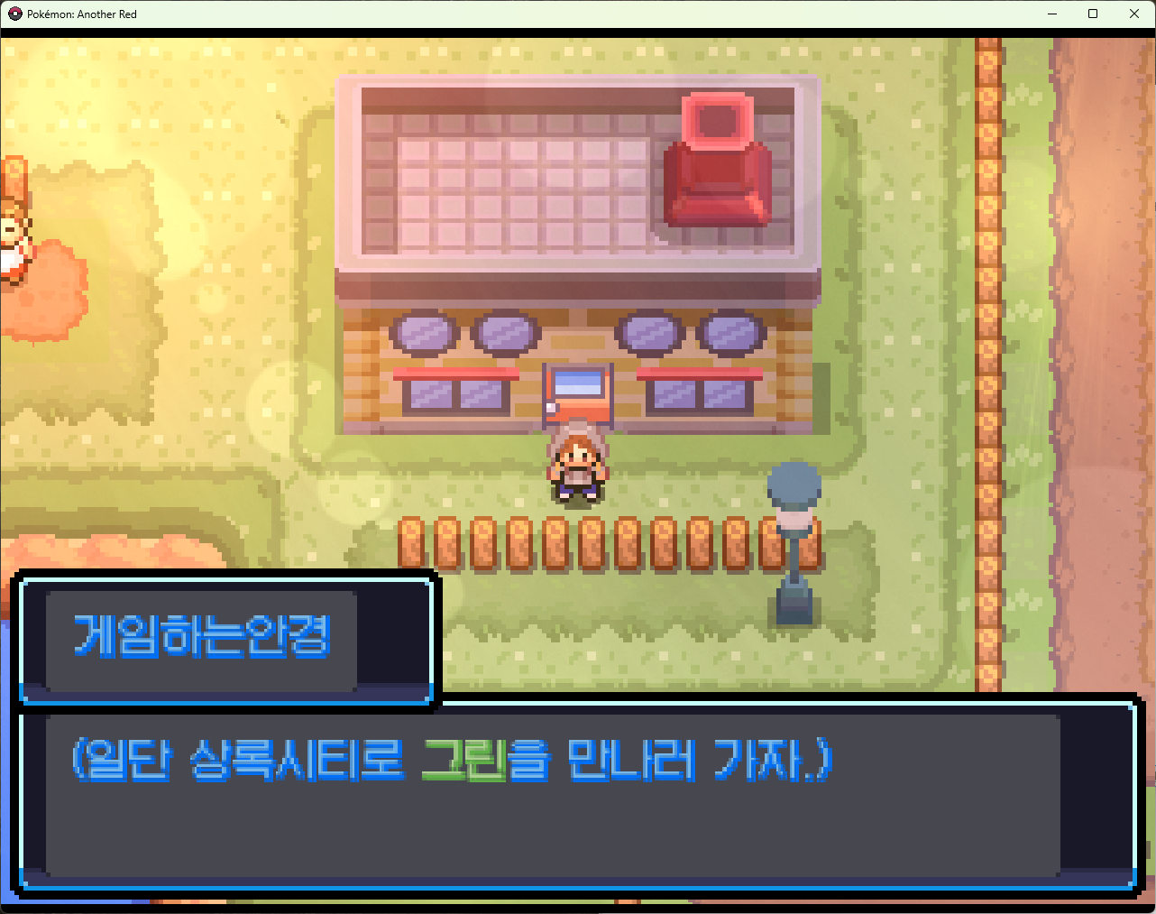 포켓몬을 고른뒤 문밖으로 나가니 상록시티의 그린을 만나러가자고 스스로에게 텔레파시가 오네요!